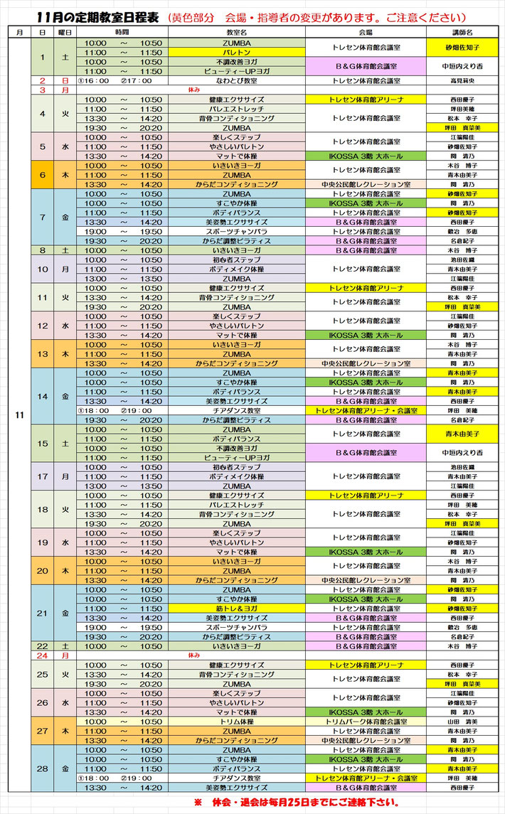 11月~3月 火曜日 健康エクササイズ(西田講師)は中央公民館大ホールの改装のため使用できませんので、トレセン体育館アリーナで行います。大ホール以外は使用可能です