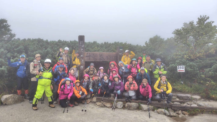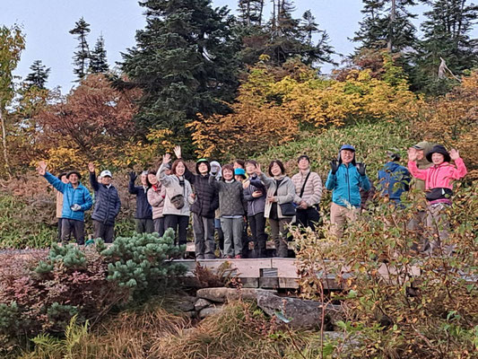 今まで白山に登った方は多くいるでしょうし、何回も登っている方でも、このコースは知らない方が多いのではないでしょうか?下の展望台での集合写真の樹間には、白山と別山が額縁に入っているように見えました。(残念ながら写真では光のために映っていないようです)