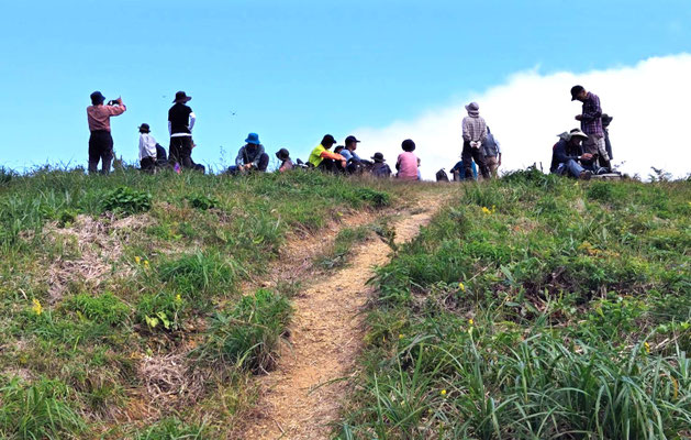 高山植物園ではニッコウキスゲが満開で、他の花々を圧倒し、他の小さな花々がかすんでしまっているようです。その中でもハクサンフウロ、ササユリ、イブキトラノオなどが咲いていました。以前来た時には、シモツケソウ、タカネマツムシソウなどが多くみられたのですが、わずかの来園時期のちがいかもしれません。女性の方も多く参加してくださり、植物園も若々しい方たちで映えていました。ちなみに筆者の名前は〇映です。