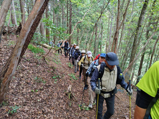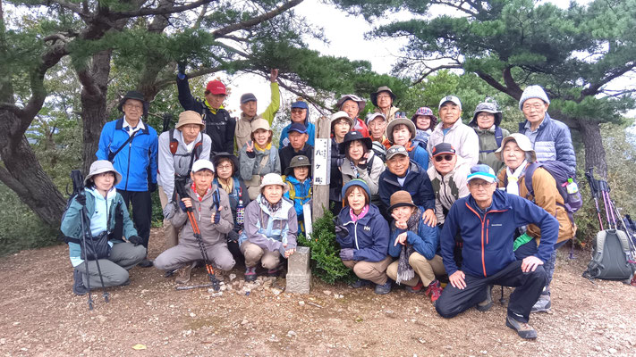 由良ヶ岳は640m(西峰)の山ですが、登り口は海抜4mで山の高さ分登ることになります。夏のような暑い日となり、登りのきついところもあり、皆さん多少へばったところもあるようでした。海と川と半島を見下ろせる素晴らしい山でした。 参加者26名