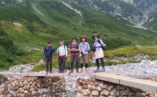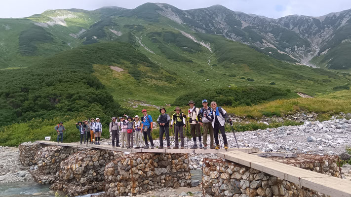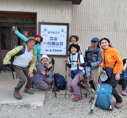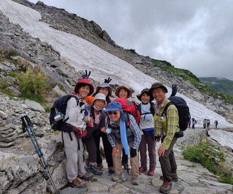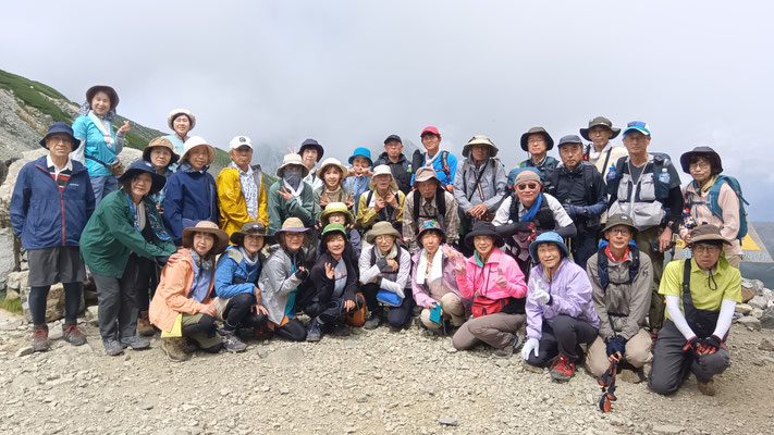今回は大型バスで立山室堂まで行けることから、月2回行っていた教室を1回にしました。そのため、トレッキング教室を始めて最高の参加者数で41名の方が参加しました。今回は立山の雄山でなくて、剣岳を間近に見ようということで剣御前小屋までのピストン山行きです。室堂から雷鳥沢に170m下り、剣御前小屋まで約500m登ります。帰りは逆コースとなります。帰りの雷鳥沢からの登り返しは階段の連続で体力度が要求されました。それでも皆さん予定の時間で日程をこなすことができました。少し残念なことは、剣岳の頂上はガスに覆われはっきりとみることはできず、写真の剣岳の頂上が見えたのは一瞬でした。でも常に八ツ峰の方はよく見えました。なお、写真にあるように、7人の別動隊は体力を鑑みて別行動で一ノ越山荘方面に行きました。剱岳とは反対方向の山々を見ることができたそうです。。