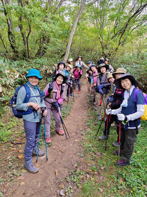 あわらトリムクラブのトレッキング教室のメンバーは岩谷俣谷探勝路の白山パノラマ展望台登頂を目指しました。標高差450m程度なので「ゆるゆる登山」のつもりでしたが、左回りコースをとったためか、期待のゆる山登山とは違って急登の連続でした。