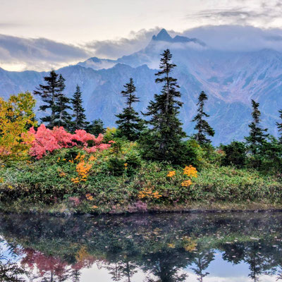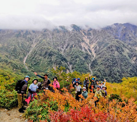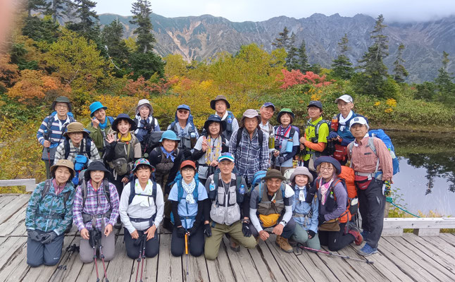 当初予定していた涸沢での宿が予約者殺到で確保できなかったため、鏡平にコース変更しました。鏡平も涸沢に劣らず紅葉のきれいなところです。。晴れて風がない場合は、鏡池に映る槍ヶ岳・穂高連峰は素晴らしいの一語に尽きます。今回は曇り空でしたが、槍ヶ岳から穂高連峰の峰々を黒いシルエットながら望むことができました。また、2日目も雨で弓折岳登山はあきらめていたのですが、朝は晴れて頂上を極めることができました。上から鏡平を見下ろすと、紅葉の中に鏡池が収まり、写真映えがしました。皆さん、いろいろなポーズで写真を撮っていました。やはり秋の紅葉は高い山がいいですね!