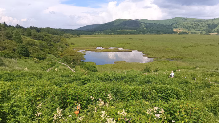 今年の7月は異常な暑さです。連日、各地で最高気温が35度以上の日がつづいています。そのためかどうか、長野県の山岳地では午後から雷が発生しています。24日の霧ヶ峰でも大きな音ではないものの、ゴロゴロとなりました。おかげで昼食時間の車山では、展望テラスの下で昼食をとる羽目になりました。小雨の降り、八島湿原へのルートを変更しました。喋々深山~物見岩コースを断念して、八島ヶ原湿原の南側ルートを歩きました。木道の両側には高山植物が咲き乱れ、周囲の景色は緩やかな山並みが望まれました。
