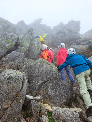 9月の第1回目の1泊2日のトレッキング教室は、晴れ男がいてもダメでした。ただ雨に合わなかっただけでも「よし」とするかです。言い訳にもなりませんね。1日目はガスの中でしたが、ガスが風に流され周りの風景が時々見ることができました。その中で上級者のコースである宝剣岳に12名が頂上を極めました。クサリ場の連続で、一部は谷底に落ちるのではないかと思える箇所もありました。頂上では皆さん大満足の笑顔でした。宝剣岳に行かない方は、木曽前岳を目指しました。のんびりした尾根コースでゆったりと登ることができました。天気に恵まれていればルンルン気分で行ってこれたでしょう。